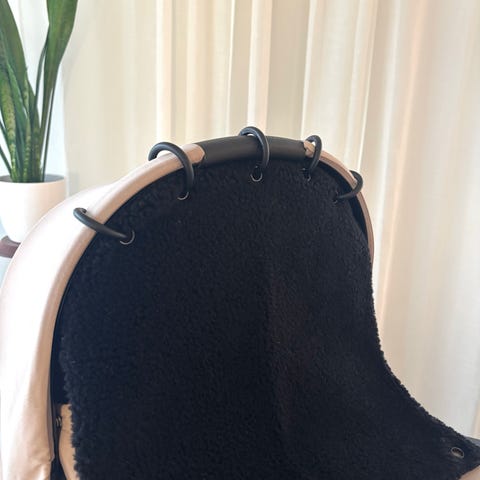 Itse tehty vaunuverho seeprakuvioista kangasta. Mukana AddBabyn mustat renkaat, 5kpl. Alareunaan voi kiinnittää halutessaan omat narut tai renkaat.