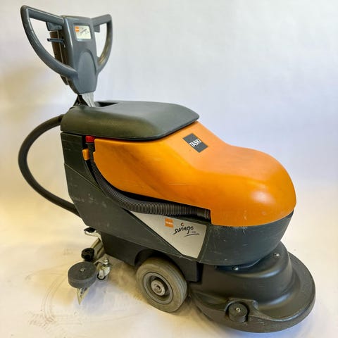 Taski lattianpesukone ajettava malli. Kone soveltuu kovien lattiapintojen pesuun ja puhdistukseen esimerkiksi varastoissa, liikehuoneistoissa tai muissa suuremmissa tiloissa. Laitteessa on ohjauspyörä edessä ja vesisäiliöt pesu- ja likavedelle. Mukana pyörivä harja-/laikkayksikkö sekä punainen puhdistuslaikka lattianhoitoon. Sähkökäyttöinen kone, jossa letkut ja liitännät valmiina käyttöä varten.
