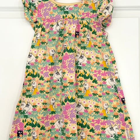 Muumi mekko tytöille, koko 110. Mekossa on kirjava Muumi-aiheinen kuosi. Pitkähihainen paljon käytetty pinnasta näkee kulumaa, lyhyt hihainen vähemmän käytetty. Ehjiä ja muuten siistejä.