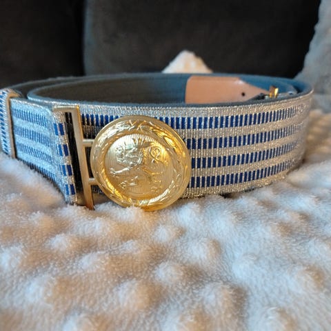 Kohtalaisen hyväkuntoinen Upseerin juhlavyö leijona soljella. (Pituus 105cm)