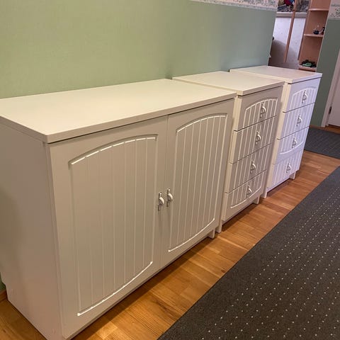 Valkoinen puinen lipastokaappi, jossa kaksi ovea ja kolme vetolaatikkoa. Metalliset vetimet ovissa ja laatikoissa. Sopii esimerkiksi olohuoneeseen, ruokailutilaan tai eteiseen säilytyskalusteeksi astioille, tekstiileille tai muille tavaroille.