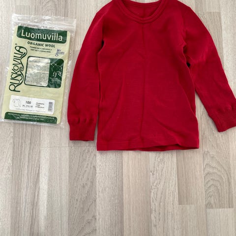 Ruskovilla silkkivilla paita. Kokomerkintä 110, mutta kutistunut ahkerassa käytössä (ollut muiden ohella yöpaitana), ottaisin käyttöön koossa 98.