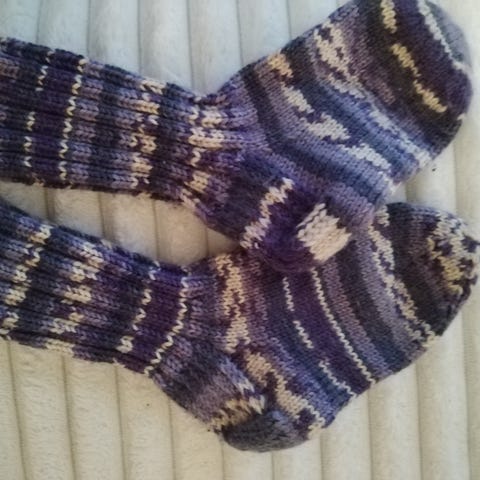 Lilat, itse neulotut sukat pohja 19 cm, korkeus 22 cm, koko lienee 28 ja lapaset 24,5 cm. Lanka 75 % villaa.