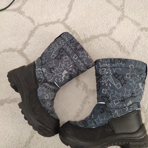 Kuoma lasten talvikengät, koko 30. Väri musta harmaalla varrella, unisex-malli. Kengissä on paksu ja kuvioitu kumipohja, joka antaa pitoa liukkaalla alustalla. Päällinen on suunniteltu talvikäyttöön ja sisäpuolella on lämmin vuori. Sopivat arki- ja ulkoilukengiksi kylmään säähän sekä tytöille että pojille.