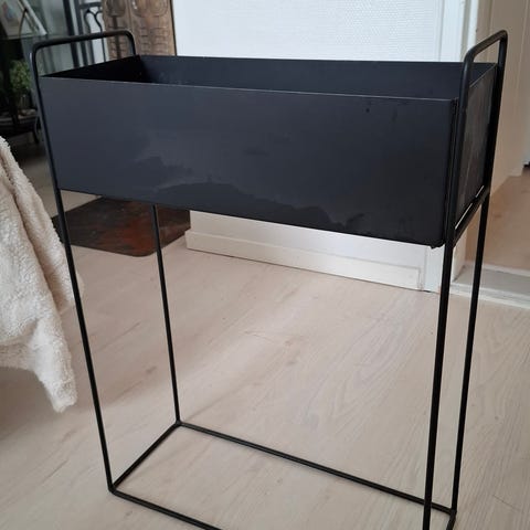 Metallinen teline (k 27.5 cm, l 15 cm, s 15 cm) muovisella ruukulla (k 10 cm, halkaisija 11.5 cm).