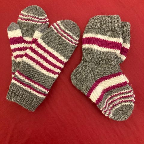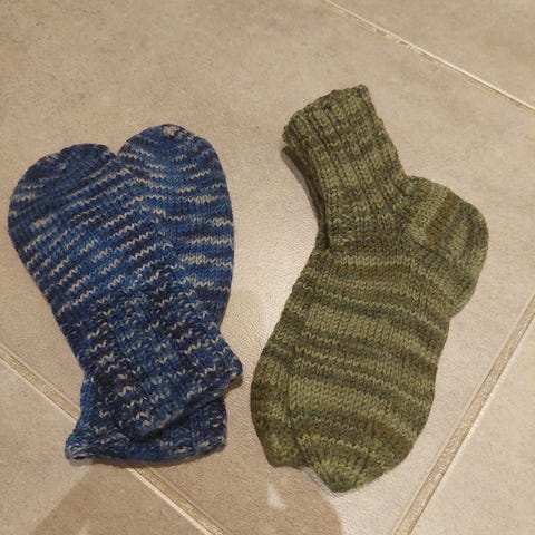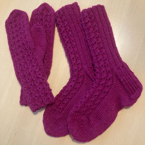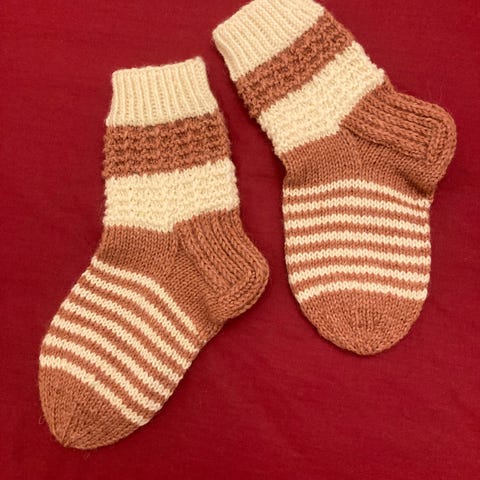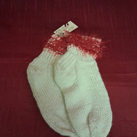 Kelta-valkoiset, koristeelliset itse neulotut 75 % villaa sukat, pohja 17 cm, korkeus 15 cm, lienee kokoa 26.