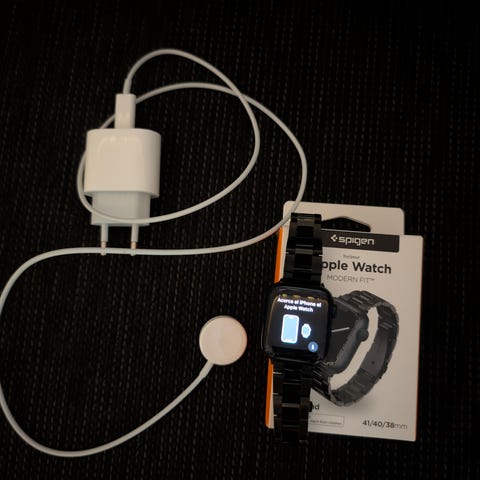 Apple Watch SE starlight värisenä. Mukana kuvassa näkyvät laturinjohto sekä vaihdettavat rannekkeet. Alkuperäinen ranneke S/M ja myös M/L kokoinen rannekeosa pakkauksessa.