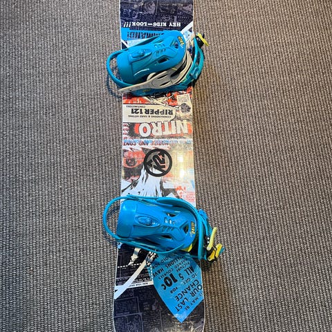 Hyvä junnujen puuydin lumilauta Nitro Ripper+Nitro Charger mini siteet. Hyvässä kunnossa ja suoraan valmis laskemiseen.