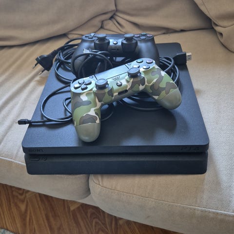 Sony Playstation 4 -pelikonsoli. Mukana langaton ohjain, rattiohjain ja poljinsetti ajopelien pelaamiseen. Kuvassa näkyy lisäksi yksi Gran Turismo Autopeli.