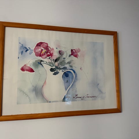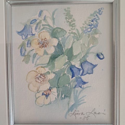 Minna L. Immonen 1988 printtitaulu, jossa akvarellitekniikalla kuvattu tyttö polkupyörällä kukkien keskellä. Teos on kehystetty puukehyksiin. Taulu sopii seinälle ripustettavaksi esimerkiksi olohuoneeseen, makuuhuoneeseen tai lastenhuoneeseen. Takana on ripustusvaijeri kiinnitystä varten.