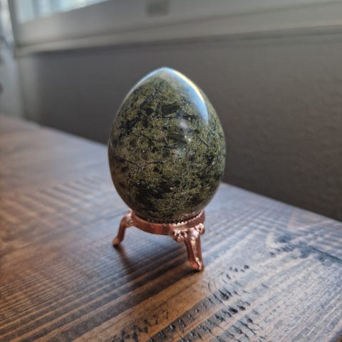 Myydään sepentiini kivimuna (nro 3). Ruusukullan värisen jalustan saat mukaan.