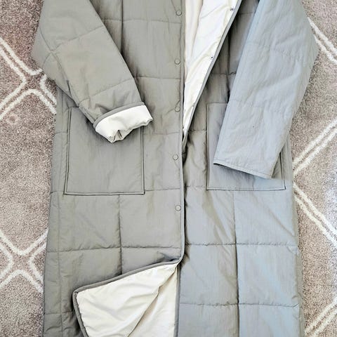 Uusi reserved naisten toppatakki koossa L. Pitkä, kaunis heleän vaaleanpunainen takki, jonka materiaalina on polyesteri. Takissa on kiinteä huppu kiristysnyöreillä. Lämmin takki kylmille keleille.