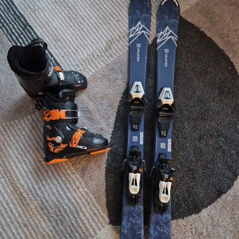 Myydään oikein hyvä lasten laskettelupaketti,Salomon sukset 110 Ezy Trak sitein,joissa laaja säätövara ja Atomic monot,joissa 4 kiristintä+ panta mondo 23,5,vastaa kenkäkoossa 36-37