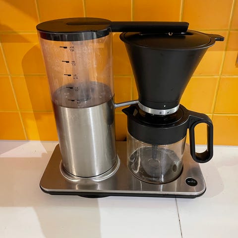 Wilfa kahvinkeitin. Laitteessa on valkoinen runko ja musta suodatinosa sekä kahvipannu. Läpinäkyvä vesisäiliö sijaitsee keittimen sivulla, ja kahvipannu on lasia muovisella kahvalla. Kahvinkeitin soveltuu suodatinkahvin valmistukseen kotikäyttöön.