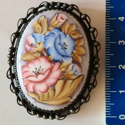 Mustapohjainen, venäläistyylinen, maalattu vintage rintaneula / rintakoru Neuvostoliitosta 1880-luvulta. Ollut käyttämättömänä. Materiaalista en ole varma, ei kuitenkaan ihan kevyt. Mieluiten nouto.