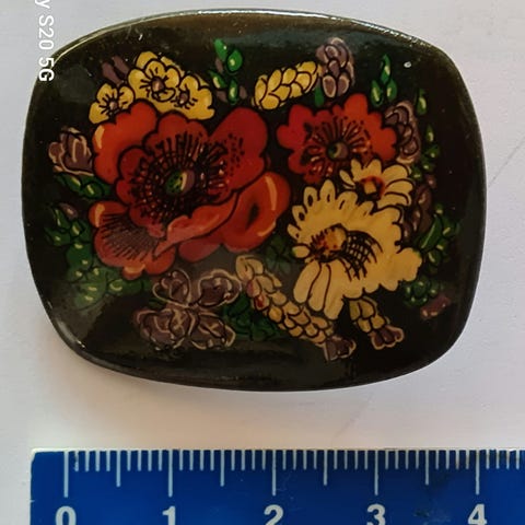 Kaunis ilm. posliininen maalattu rintakoru tai rintaneula. Siro koristeellinen metallikehys. Peräisin Neuvostoliitosta 1980-luvulta. Täysin käyttämätön.