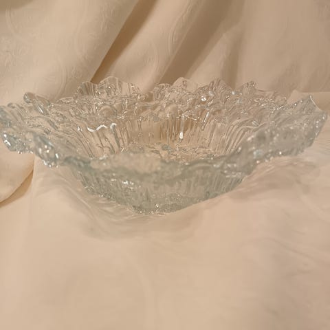 Кaunis lasikulho Riihimäen Lasi Solina -sarjasta. Kulhossa on näyttävä, jäätä muistuttava teksturoitu pinta, joka heijastaa valoa kauniisti ja tekee esineestä sekä koristeellisen että käytännöllisen.