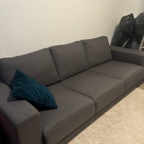 Myydään muutaman vuoden vanha sohva uuden sohvan tieltä. Sohva on ikean runko ja siinä on tukeva 80x200 patja jolla pystyy myös nukkumaan mukavasti. Päätyseinät saa vaihdettua sisustukseen sopivasti jompaan kumpaan päätyyn. Kolmen selkänojatyynyn ja patjan päällisen saa helposti pestyä koneessa.