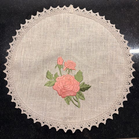 Pöytäliina sinisellä kirjonnalla ja virkatulla reunuksella 70x70 cm