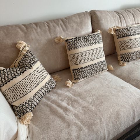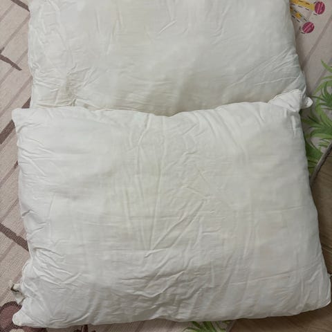Pehmustetut kuviolliset täytetyt 100% puuvillatyynyt Indonesiasta, toinen sinertävä, toinen oranssi, takaa valkoiset. Kunto hyvä, paitsi oranssin päällikankaassa pienet repeämät, eivät vaikuta ulkonäköön.