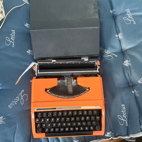 Erika -merkkinen mekaaninen kirjoituskone. Mukaan metallinen kuljetuskotelo, jonka sisäpuolella on puhdistusharjat kiinnikkeissään.