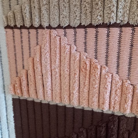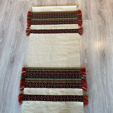 Raidallinen mattoseinäraanu, jossa vihreän eri sävyjä, oranssia, keltaista, mustaa ja beigeä. Raanussa on pitkittäiset raidat ja tiheä kudonta. Sopii käytettäväksi esimerkiksi seinävaatteena, keittiössä tai olohuoneessa. Materiaali on kangaspuissa kudottua villaa. Värit: vihreä, oranssi, keltainen, musta ja beige raidallinen. Erittäin hyvässä kunnossa. Kauniisti sointuva väritys. Hinta 17 euroa. Voin lähettää. Mmm.