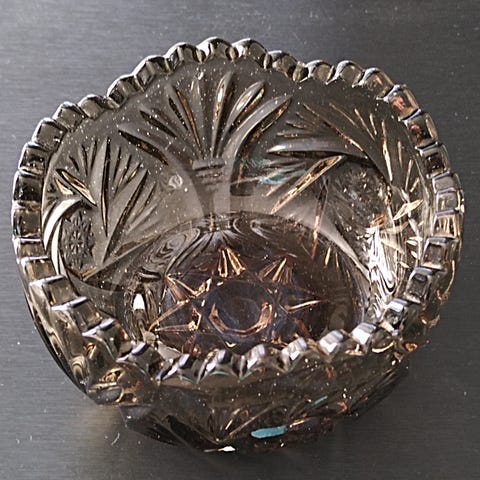 Lasiastia, käsinhiottu Riihimäen lasitehtaalla, halkaisija 20 cm, korkeus 6,5 cm, alunperin tuhkakuppi