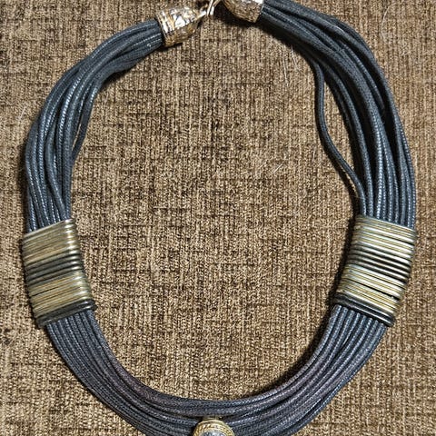 Suomalainen design-koru, terracotan ( oranssi) väriset nahkaympyrät ketjussa ( pituus n. 75 cm). Siisti ja ehjä koru. Nouto tai kirjepostitus.