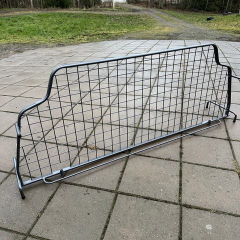 Metallinen koira-aitaelementti autoon. Väri musta. Soveltuu tavaratilaan asennettavaksi koiraverkoksi tai tilanjakajaksi, estämään koiraa siirtymästä matkustamoon. Rakenne on teräslankaverkkoa, ja elementissä on muotoiltu yläosa auton sisätilan muotojen mukaan. Kiinnikkeet näkyvät kuvassa, ja aita voidaan asentaa auton rakenteisiin sopivalla tavalla. Sopii käytettäväksi koiran kuljettamiseen autossa sekä tavaratilan rajaamiseen.