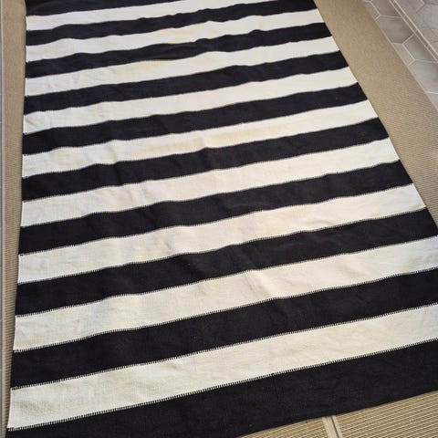 Puhdas, juuri pesty musta-valkoraidallinen matto, koko 195x133. Taloudessa ei eläimiä.