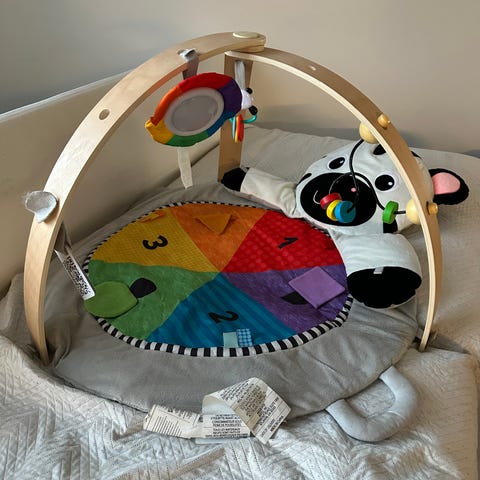 Vauvan leikkimatto, lelukaari sekä lelut ja tyyny.