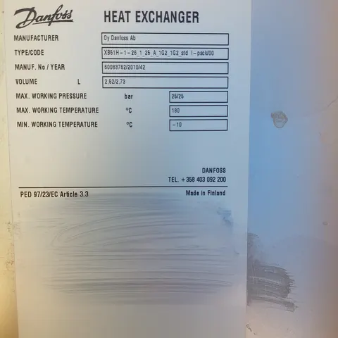 Jäi ylimääräiseksi lämmitysremontissa. Lämmönsiirrin valittu siten, että se johtaa hyvin matalia lämpötiloja lattialämmityksen (etanoli) sekä lämpöpöumpun kesken.