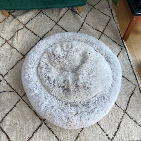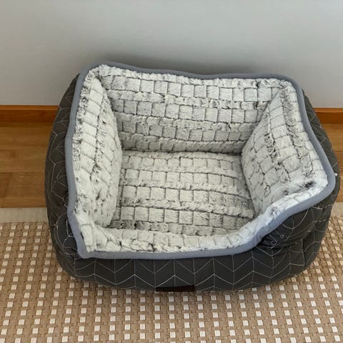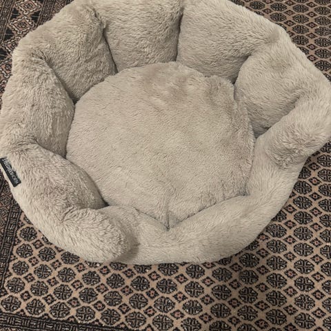 Peti hankittiin pienelle pomeranialle, jolle se oli kuitenkin liian suuri eikä kelvannut. Peti on käyttämätön oikea Calmbed ja leveys 60 cm. Väri näkyy kuvassa.