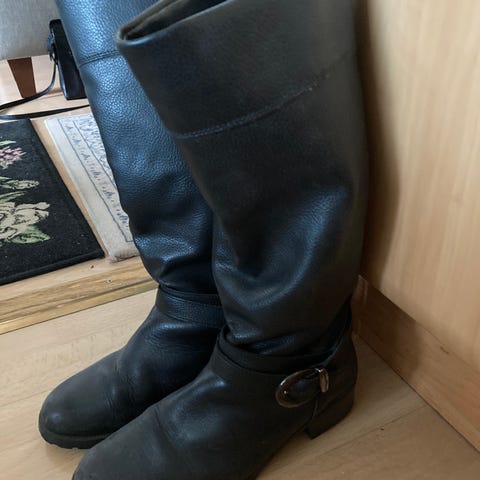 Hyväkuntoiset, mustat, nahkasaappaat, lämmin vuori. Erittäin tyylikäs soljellinen polven alle ulottuva varsi. Pohjissa juovia, joten eivät liukkaat. 37,5 koko, suht iso koko. Saksalainen valmistaja. Täysin ehjät.