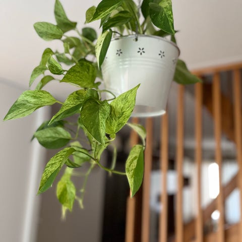 Kultaköynnös, helppo hoitoinen. Myydään ilman kultaksta jalustaa, eli kasvi ja valkea sisäruukku.