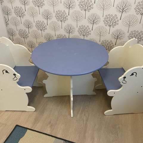 Hyväkuntoinen lasten pöytäsetti, pöytä ja 2 tuolia. Pöydän halkaisija 60cm ja korkeus 45cm. Erinomaisessa kunnossa. Ainoa miinus pieni naarmu pöydässä.