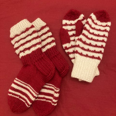 Käsin neulotut lila-valko-harmaat, 75 % villaa, sukat pohja 15 cm, samoin korkeus, vastannee kokoa 20, lapaset 23 cm.