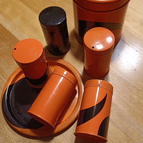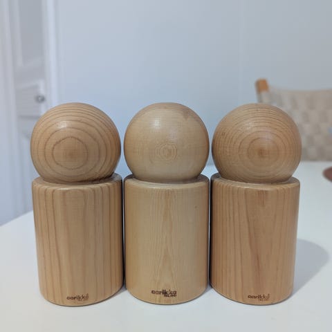 Aarikka puinen suola- ja pippurisetti. Settiin kuuluu kaksi puista maustemyllyä tai -purkkia, joissa on irrotettavat pyöreät puukannet. Kuutio-osassa on kaiverrukset S ja P erottamaan suola- ja pippuripurkin toisistaan. Valmistettu luonnonvärisestä puusta, pohjassa Aarikka-merkintä. Sopii pöytämausteiden säilytykseen ja kattaukseen. Aarikan vanhaa tuotantoa.