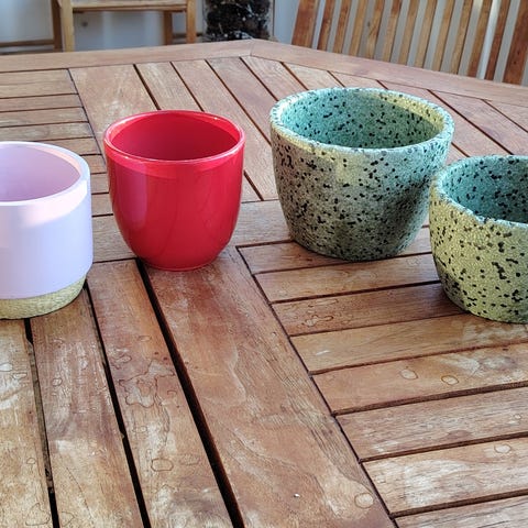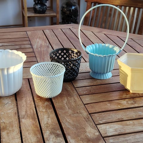 Myydään kuvan puiset ja rottinkiset suojaruukut.