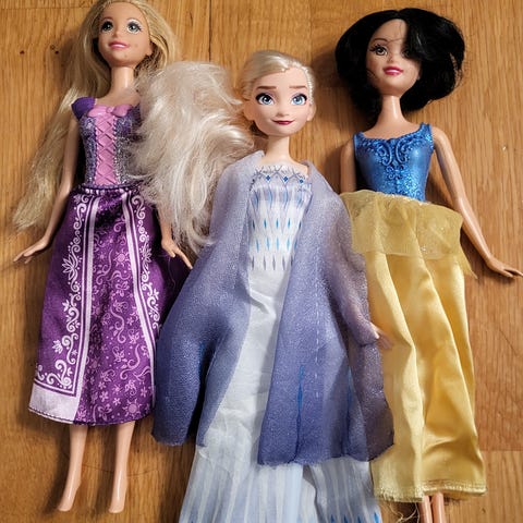 Myydään muoviset Disney nuket seuraavalle leikkijälle. Yksi ylimääräinen mekko mukaan.