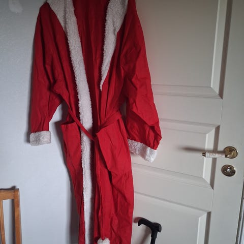 Joulupukin hupullinen takki teddyä valkoisin teddysomistein. Asuun kuuluvat vyö, hiippalakki, kiharat peruukki ja parta.
