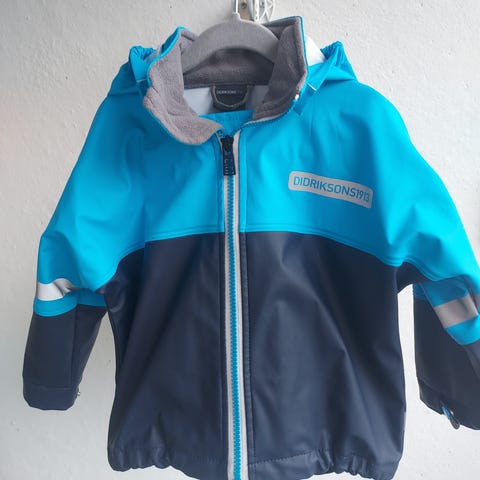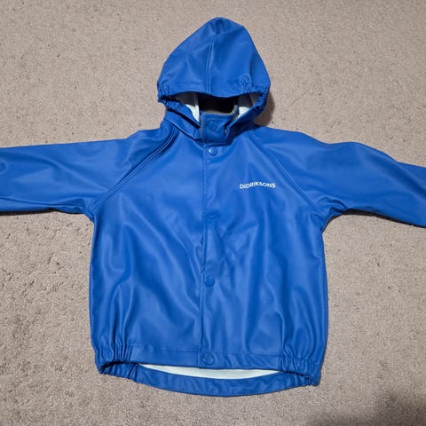 Hyväkuntoinen Didriksons sadetakki, koko 80. Edessä nepparit, ei vetoketjua. Irrotettava huppu, hyvät heijastimet.