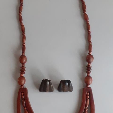 Omalla tavalla ihanan näköinen puinen korusetti. Kaulakorulla riittää pituutta yllin kyllin ja muutenkin söpön näköinen kun päälle puettu