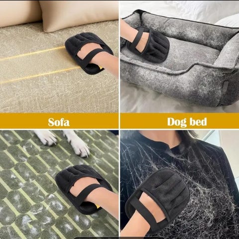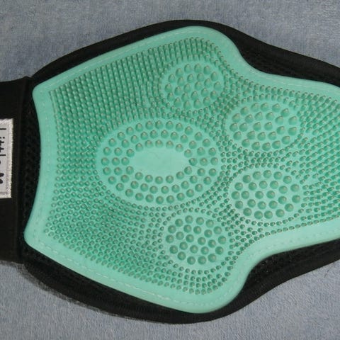 Little Bigger lemmikin harjaushanska, väri sininen. Hanskassa on toinen puoli pehmeää kumia tiheillä nystyröillä karvan ja irtokarvojen harjaamiseen sekä ihon hierontaan. Toinen puoli on tekstiilipintainen, joka kerää karvat. Ranteessa on tarrakiinnitys, joka auttaa pitämään hanskan kädessä harjauksen aikana. Soveltuu esimerkiksi koirien ja kissojen turkin hoitoon. Uusi.