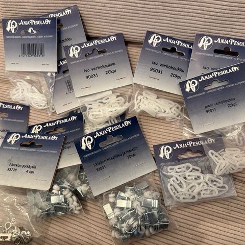 Ylimääräiset uudet verhojen ripustuskoukut myyn seuraavalle alehintaan. Määrä vastaa kolmea pussillista uusia.