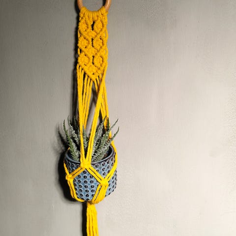 Beige seinälle laitettava makrameeamppeli kukkaselle.