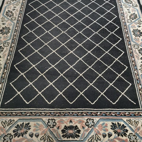 Siisti, vanha, tasaisesti tamppaantunut matto. Ei tahroja. Tuuletettu pakkasessa, mutta suosittelen pesua ennen uuteen kotiin vientiä.