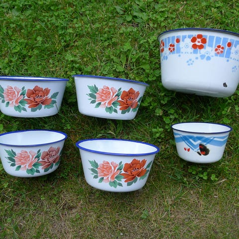 Kuvan mukainen satsi emaliastioita jotka lähinnä koristeeksi koska sisäpinnat on hyvinkin kuluneita. Kahvipannun vetoisuus on 1.5 litraa. Kattilaan löytyi kansi, viimeinen kuva...