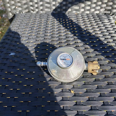Nestekaasupullo 6,5 kg, harmaa. Käytetty, tyhjä ja ehjä. Teräksinen kaasupullo, jossa venttiili yläosassa. Soveltuu esimerkiksi grilliin, retkikeittimeen tai muuhun nestekaasulaitteeseen, joka käyttää tämän kokoista pulloa.