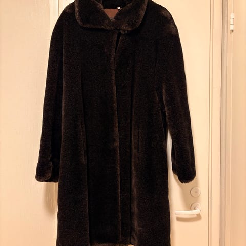 Myydään hyväkuntoinen tekoturkki. Käytön jälkiä ei ole. Sivusaumoissa on taskut. Pituus olkapäältä helmaan on 93cm. Kai-kai mitta on 73cm. Hihansuissa taittovaraa 13cm.